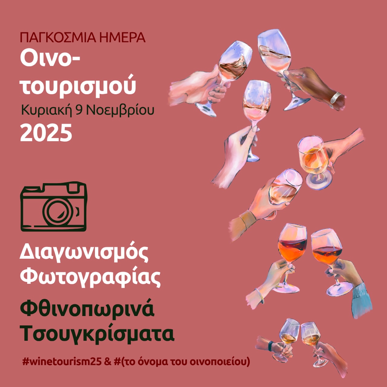 Αναρτήστε στο Facebook ή/και στο Instagram τις φωτογραφίες με στιγμές από τσουγκρίσματα ποτηριών που θα επιλέξετε, συμπεριλαμβάνοντας στην ανάρτηση τα hashtags #winetourism25 και #(το όνομα του οινοποιείου). Στη συνέχεια, η επιτροπή του διαγωνισμού θα αναζητήσει τις φωτογραφίες με το hashtag #winetourism25 και θα τις αξιολογήσει, ενώ τα αποτελέσματα θα κοινοποιηθούν την Τετάρτη 12.11.2025.