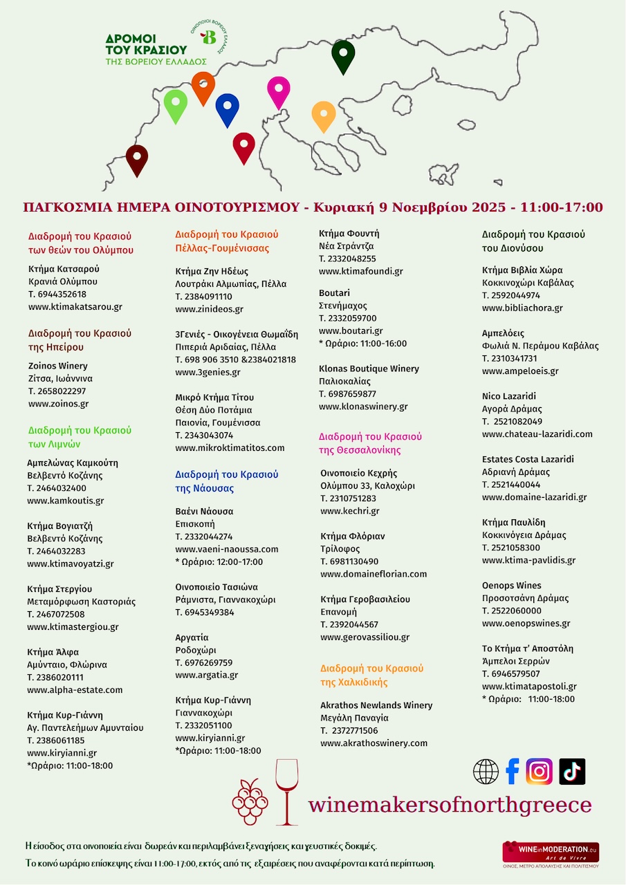 Αυτήν την Κυριακή 9 Νοεμβρίου 2025, τα επισκέψιμα οινοποιεία των Δρόμων του Κρασιού της Βορείου Ελλάδος συμμετέχουν για ακόμη μία χρονιά στον εορτασμό της Παγκόσμιας Ημέρας Οινοτουρισμού και προσκαλούν τους φίλους του κρασιού σε μια υπέροχη γιορτή αφιερωμένη στον ελληνικό ποιοτικό οίνο, τη φύση και τη φιλοξενία.